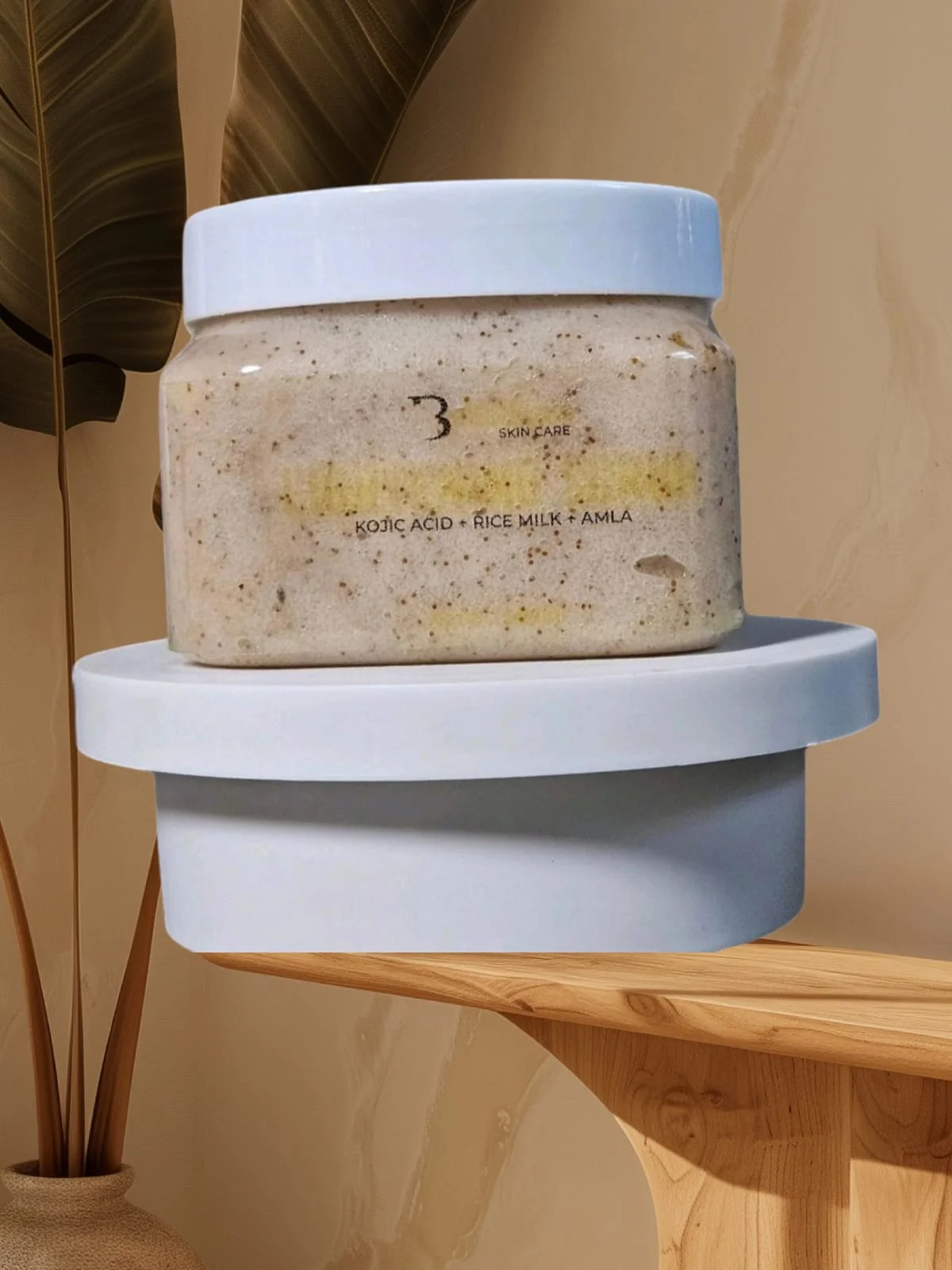 The scrub’s overall function is to gently exfoliate dead, dull skin cells while the key active ingredients work to lighten dark marks and even out the skin’s complexion, leaving the skin soft, smooth, and radiant.